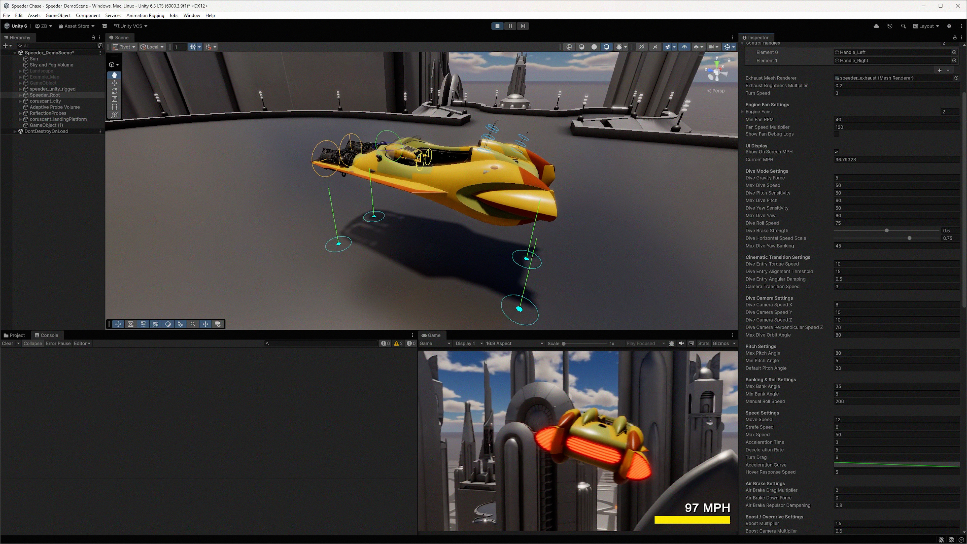 This is part of development on a project to make the speeder chase as an interactive demo. This is mainly a graphical showcase so I have taken my 3D model of Anakin's speeder and built a game-ready version and brought it into Unity. Since then I've worked on creating vehicle controls for it. The movement is inspired by the Sparrow controls in Destiny so it has that kind of turning movement where the speeder drags around the screen, though this adds vertical movement as well. The buildings are placeholder assets to have something to fly around in. Eventually the goal will be to make a demo where there's an infinite level where it randomly arranges the city blocks and allows you to fly around forever through the city. It's a big undertaking but I think it's doable, it's just a matter of having enough unique stuff that can be recombined.